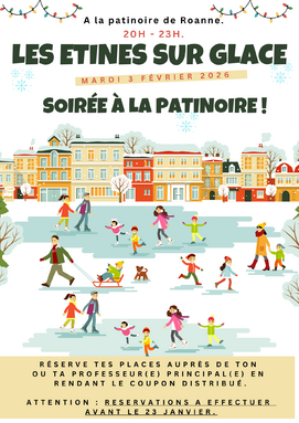 Par MANON PRETIN, publié le mardi 6 janvier 2026 15:18 - Mis à jour le mardi 6 janvier 2026 17:18Les élèves du collège sont invités à venir passer un temps de convivialité à la Patinoire de Roanne, le mardi 3 Février 2026, entre 20h30 et 23h. L'objectif est de collecter des fonds pour aider à financer le voyage scolaire des 3èmes. -